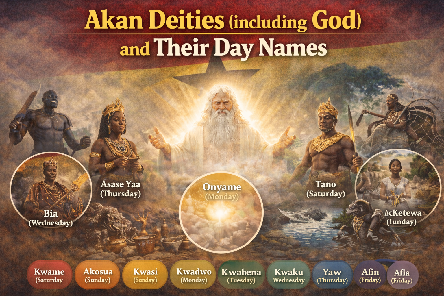 Akan Deities and Their Day Names: Onyankopɔn Kwame, Asaase Yaa, Po Abenaa and Kofi Yesu